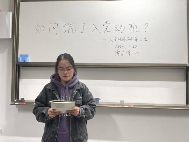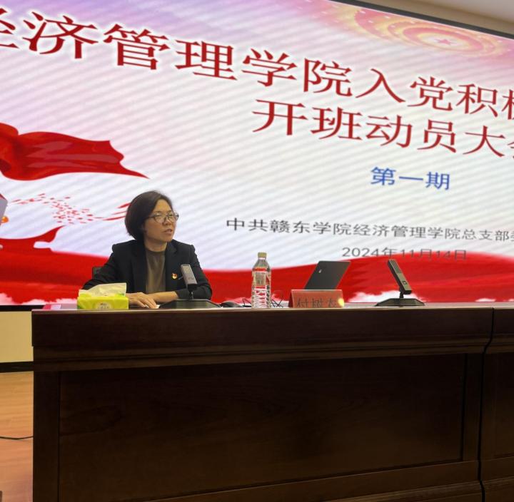 11月14日下午14:00,培训班在经济管理学院报告厅开班,经济管理学院党总支书记付树农出席开班仪式并作动员讲话,她提出三点希望:一是端正入党动机、铸就纯粹党性;二是端正学习态度,做到学有所悟,深入学习贯彻党的二十大、党的二十届三中全会精神;三是立足实际,争当先锋模范,要将所学知识和技能转化为服务群众、服务社会的实际行动,切实起到先锋模范作用。