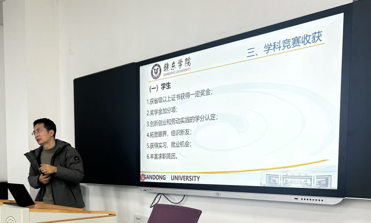 分享会上,张振凯老师和郑保洪老师的讲解干货满满。一方面,两位老师推荐了多个含金量高、适合经管类学生参与的学科竞赛项目。这些竞赛涵盖金融、贸易、创新设计等多个领域,不仅有在创新创业领域极具影响力的“互联网+”“挑战杯”等A类赛事,还有赛道丰富多样的金砖国家技能发展与技术创新大赛、专注商业实战能力培养的商业精英挑战赛等B类赛事,提供了丰富的选择方向。