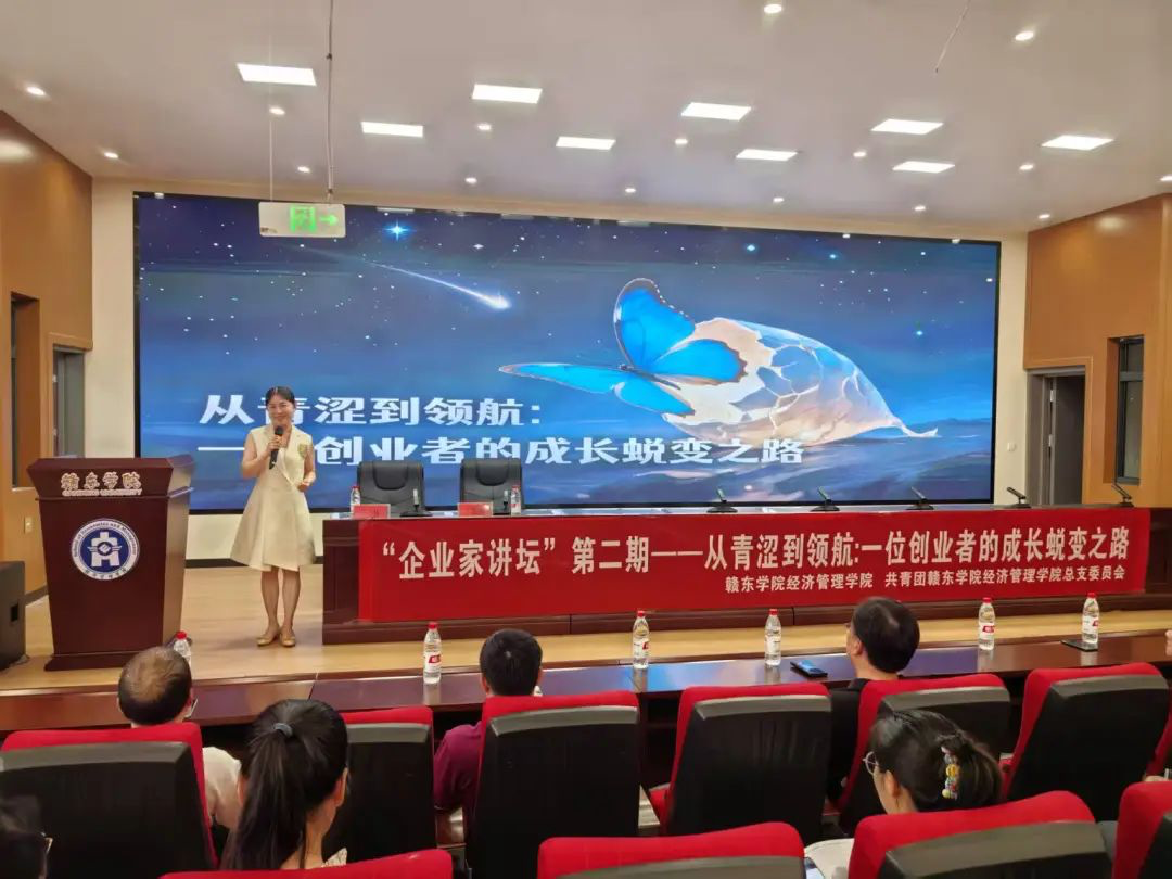 2025年6月26日下午,经济管理学院第二期“企业家讲坛”在经管楼一楼报告厅成功举办。本期讲坛特邀江西瑞一韵承科技有限公司创始人王彬女士作为主讲嘉宾,为师生带来了一场关于创业成长、外贸机遇与企业发展的精彩分享。