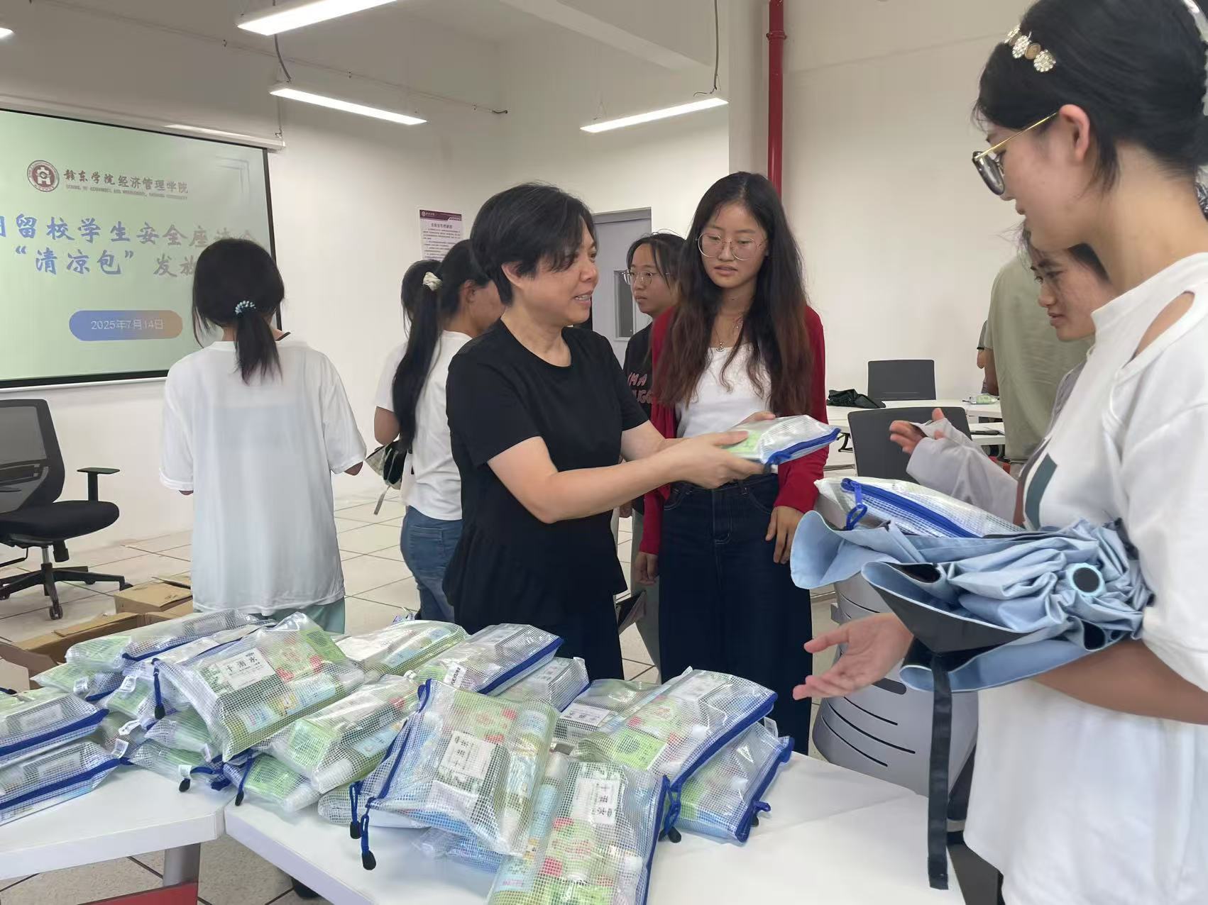 7月14日下午,经济管理学院举办2025年暑期留校学生安全座谈会暨发放“清凉包”慰问活动,为暑期留校备考学子送去关怀与支持。学院党总支负责人付树农、辅导员李硕和王颖及就业秘书尧珏出席活动。