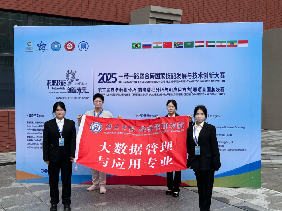 10月26日,“2025一带一路暨金砖大赛之第三届商务数据分析(商务数据分析与AI应用方向)赛项全国总决赛”在山东济南举办,经济管理学院大数据管理与应用专业学生代表队荣获本科组全国一等奖和大赛“最佳组织奖”。