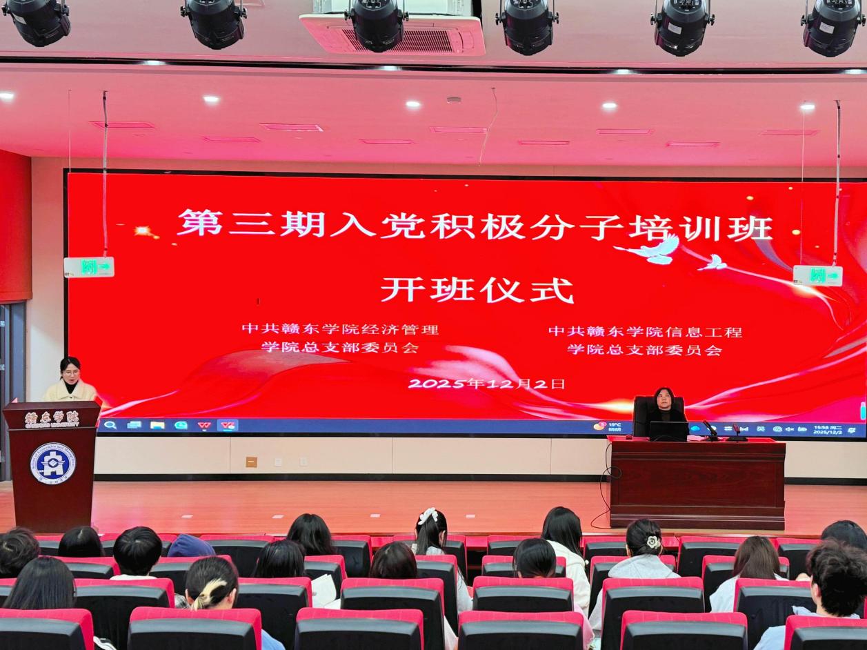12月2日下午,经济管理学院、信息工程学院第三期(2025年下半年)入党积极分子培训班开班仪式在经管楼一楼报告厅举行,经管学院党总支副书记付树农作开班动员讲话,两学院全体参训入党积极分子60余人参加。