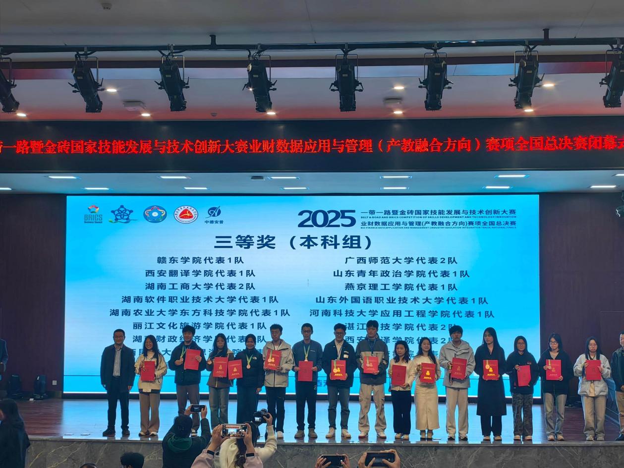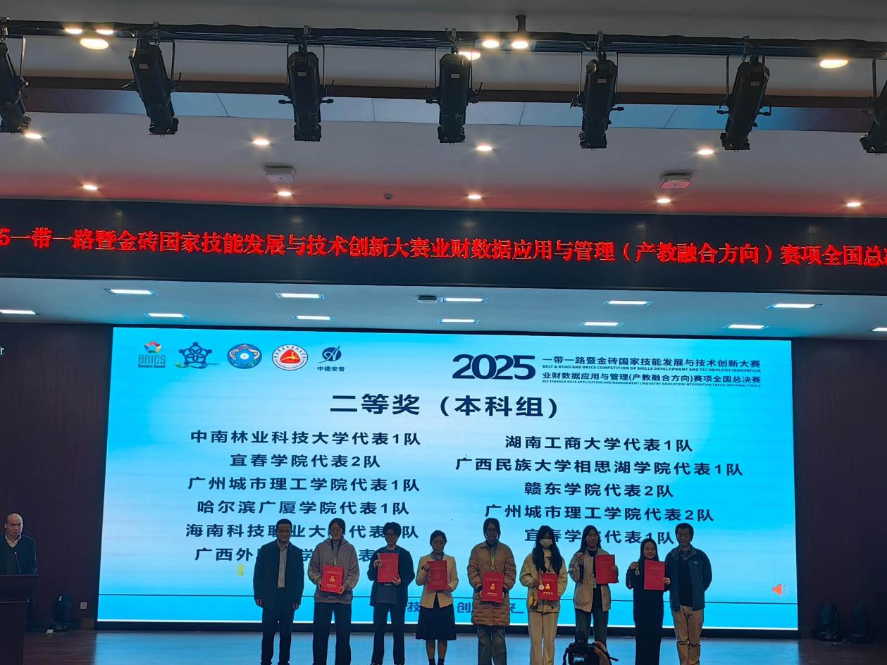 11月29日,2025一带一路暨金砖国家技能发展与技术创新大赛业财数据应用与管理(产教融合方向)赛项全国总决赛在湖南长沙举行,经管学院团队获全国二等奖1项,全国三等奖1项,同时学校荣获“优秀组织奖”,指导教师获评“优秀指导教师”称号。