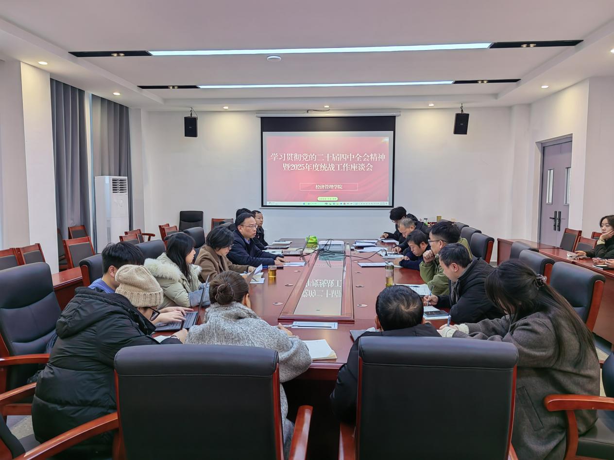 12月9日下午,经济管理学院召开学习贯彻党的二十届四中全会精神暨统战工作座谈会,以全会精神为指引谋划推进学院统战工作,凝聚党外人士等各方力量,切实将学习成果转化为推动学院高质量发展的实际成效。学院各内设机构负责人、各专业负责人及党外人士教师代表参加会议,会议由学院党总支副书记付树农主持。