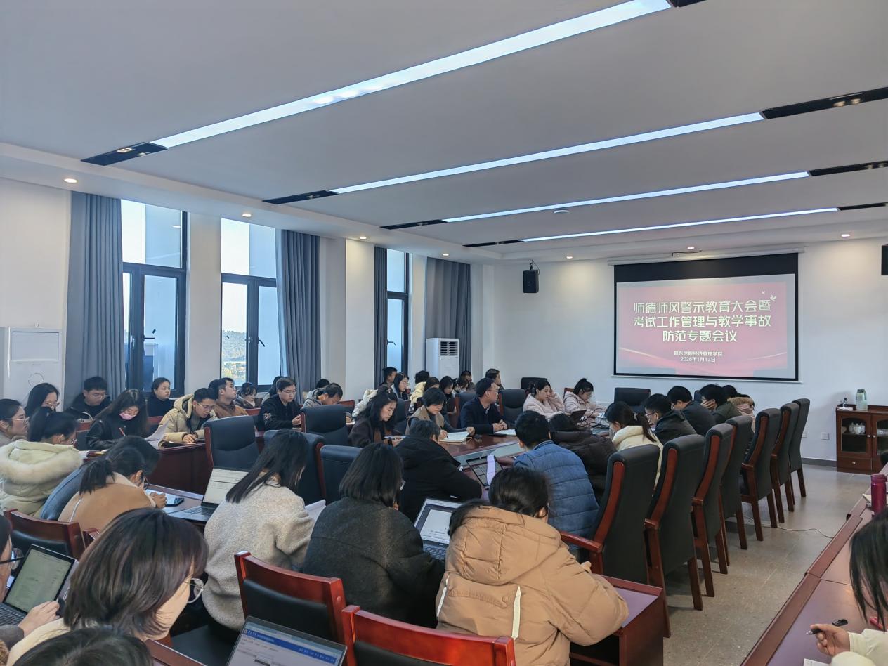 为落实立德树人根本任务,1月13日,经济管理学院召开师德师风警示教育大会暨考试工作管理与教学事故防范专题会议,全体教职工参会。