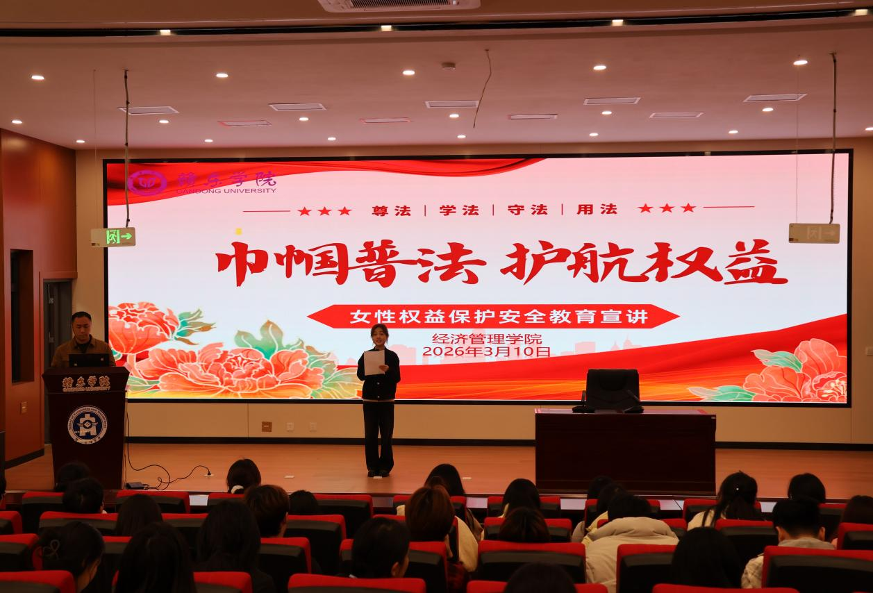 为进一步增强在校女大学生的法治意识,提升女性自我保护与依法维权能力,2026年3月10日下午14:30,赣东学院经济管理学院在经管楼报告厅举办了以“巾帼普法,护航权益”为主题的女性权益保护普法宣讲活动。活动特邀专业律师何绘乐担任主讲嘉宾,吸引众多学子踊跃参与,现场气氛热烈。