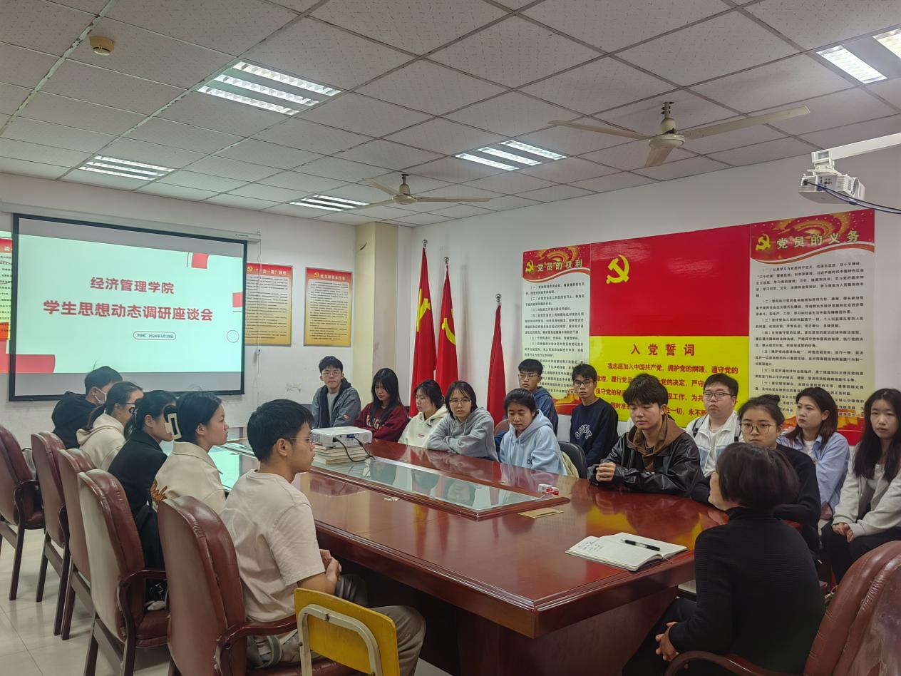 为精准把握新学期学生思想动态,及时回应学生关切,助力学生在新学期快速适应学习节奏,2024年3月12日,经济管理学院通过召开学生座谈会、辅导员走访寝室、班级主题班会等形式,全面了解学生对新校区建设、学业规划、校园生活等方面的想法与诉求。