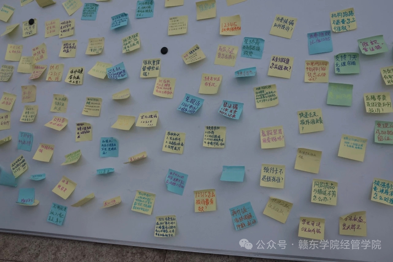 活动现场还设置了便利贴留言区,成为同学们的维权交流角落。大家踊跃提笔,写下自己了解的法治小知识、维权小技巧,同时也提出消费困惑、分享经验。一张张便利贴汇聚成“维权智慧库”,让理性维权的声音在互动中传递、在交流中升温。